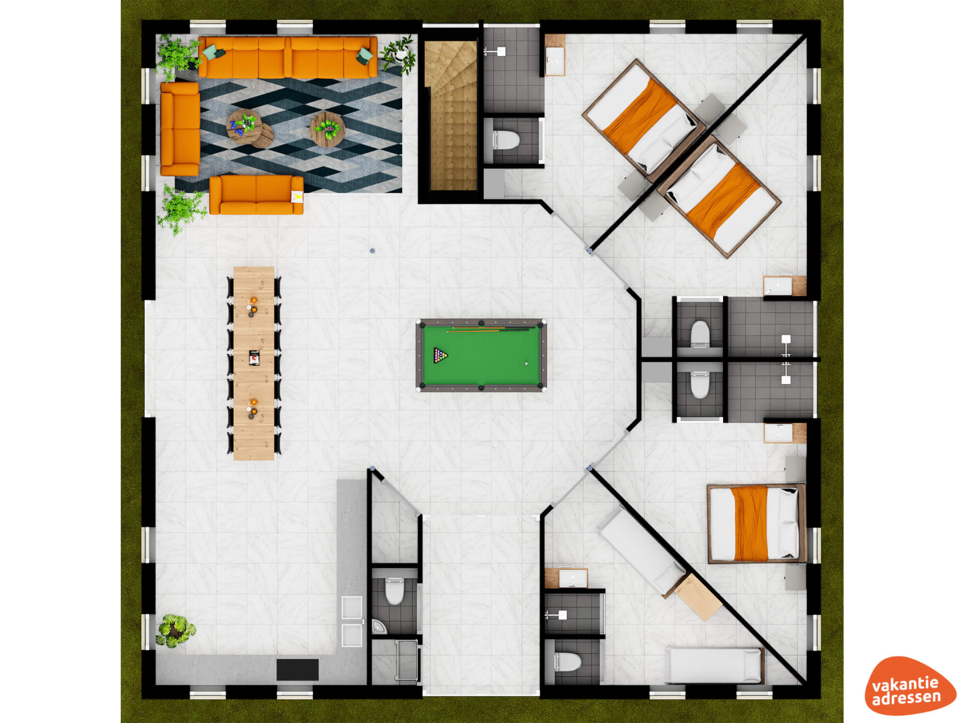 Het hart van het huis wordt gevormd door de ruime woonkamer met zithoek en open keuken. Hier kun je samen koken, borrelen of lange diners houden aan de grote eettafel. In de kelder wacht een spelparadijs: pooltafel, shuffleboard, airhockey en een voetbaltafel zorgen voor plezier voor jong en oud. Tussendoor kun je even ontspannen in de comfortabele zithoek of een spelletje spelen.