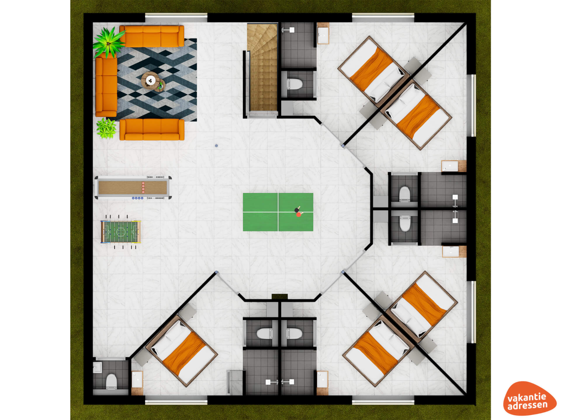 De accommodatie beschikt over 9 slaapkamers: 8 kamers met comfortabele tweepersoonsbedden en 1 kamer met een stapelbed, perfect voor kinderen. Iedere slaapkamer heeft een eigen badkamer met douche, toilet en wastafel, waardoor iedereen volop privacy en comfort ervaart. Zo kan iedereen zich terugtrekken wanneer dat nodig is, terwijl het samen zijn in de gemeenschappelijke ruimtes altijd dichtbij blijft.