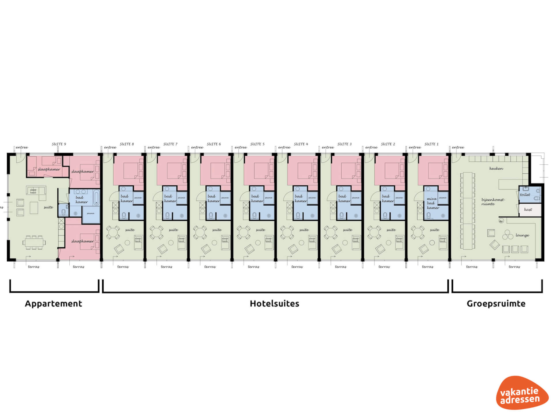 Deze locatie beschikt over acht 2- tot 4-persoons suites, een 6- tot 8-persoons appartement en een gezamenlijke ruimte met compleet ingerichte woonkeuken met lange eet- en vergadertafel voor 30 personen. Niet te vergeten een ruime loungehoek om een gezellige houtkachel. De 9 hotelsuites en gezamenlijke ruimte liggen in het verlengde van elkaar, hebben allemaal een eigen ingang en zijn enkel buitenom bereikbaar. Zo beschik je over voldoende privacy om je na een productieve dag terug te kunnen trekken.