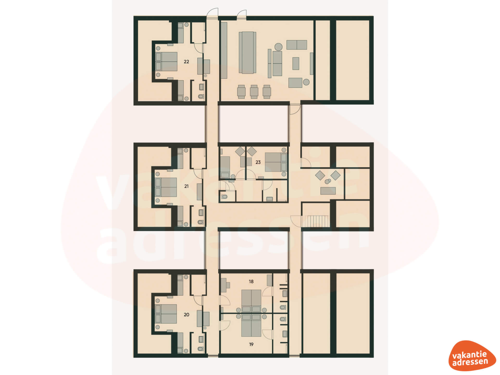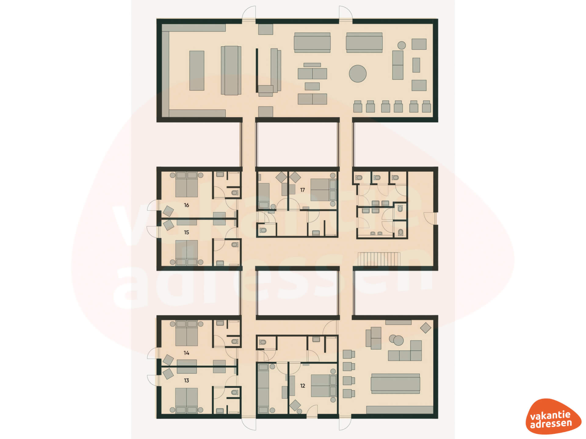 Groepsaccommodatie voor 23 personen (9 slaapkamers en 5 badkamers), zie ook virtuele rondleiding (deel 2):